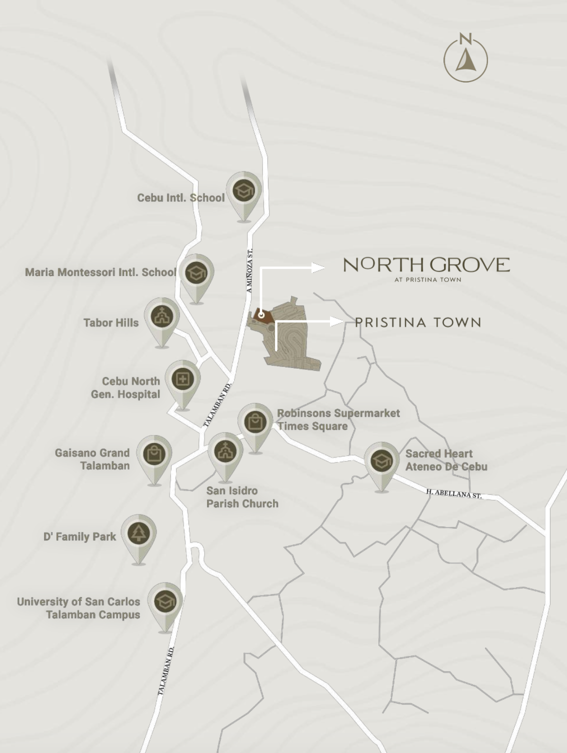 Pristina Town is a master-planned township in Brgy. Bacayan, near Talamban, Cebu City, thoughtfully designed to offer a balanced lifestyle of convenience, nature, and growth. This emerging community combines residential, commercial, and lifestyle spaces with wide open areas, future developments, and essential establishments nearby—including schools, hospitals, and shopping centers. At the heart of the township is North Grove, its first residential condo offering, where modern living meets serene, garden-inspired design. Now in its pre-selling stage, it’s the perfect time to invest and be part of Cebu’s future landmark destination.